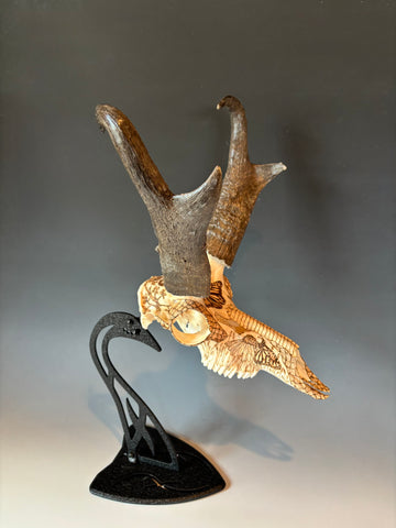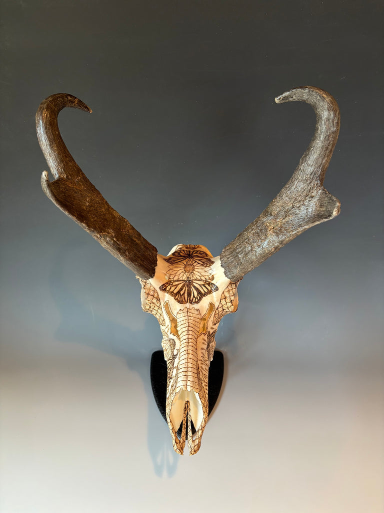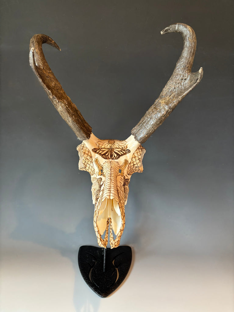 Pyrography on Pronghorn Skull with a Mattel polyurethane finish. This piece is Titled “Prairie Monarchs”.