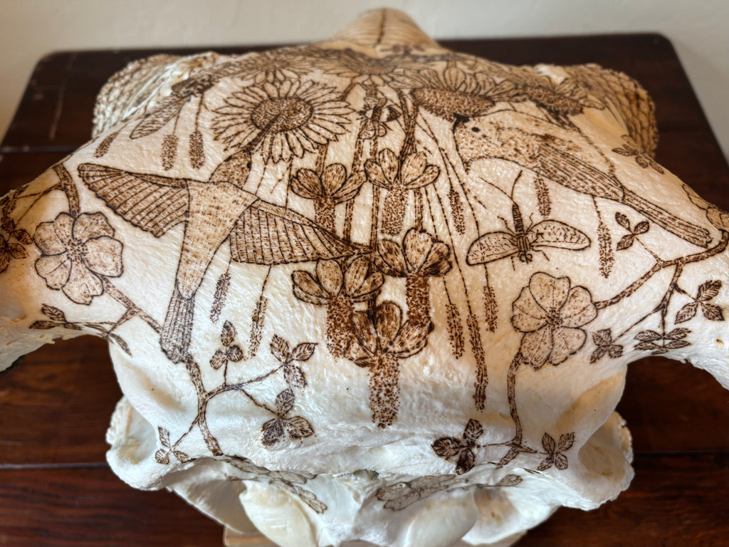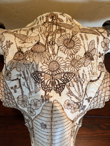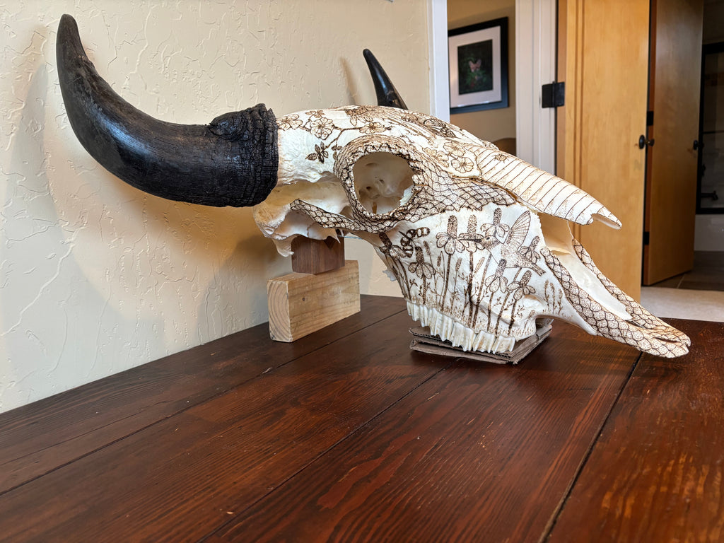 Pyrography on American Bison Skull, Titled “Ferdinand” after the bull in the 1936 children’s story “Ferdinand the Bull” by Munro Leaf.