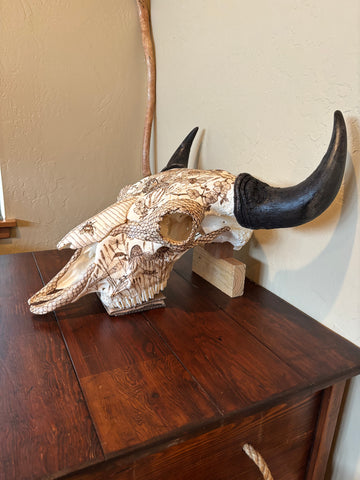 P #24, Pyrography on Buffalo Skull titled “Ferdinand”